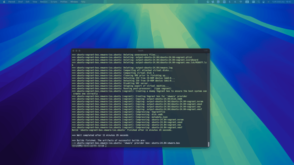 以下コマンドを実行することで、Vagrant Boxファイルが自動生成されます。
