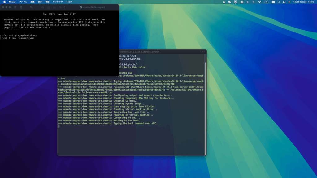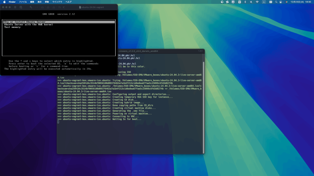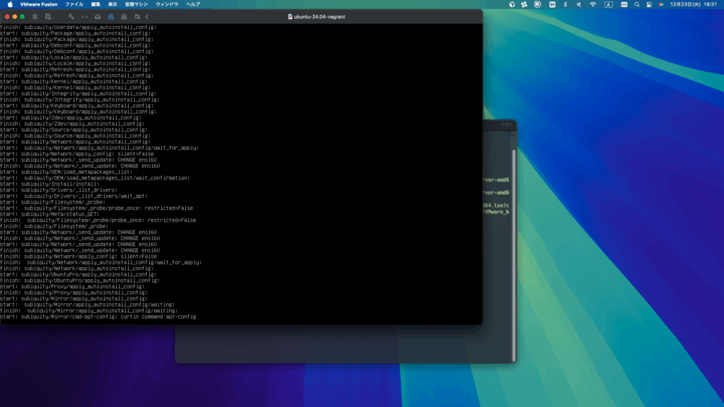 実行中は VMware Fusion のウィンドウが自動で立ち上がったり、コマンド入力が行われたりします。
